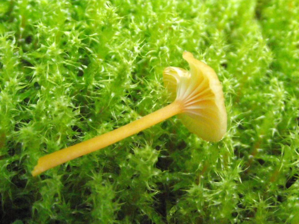 Stiel: max. Stielgröße 5 cm, max. Stielbreite 0.3 cm; zylindrisch, dünn, lang und hohl, meist etwas verbogen und gegen Stielspitze am Lamellenansatz etwas verbreitert, ganzstielig fein bereift, Basis etwas zugespitzt, wie der Hut gefärbt, Basis weißlich