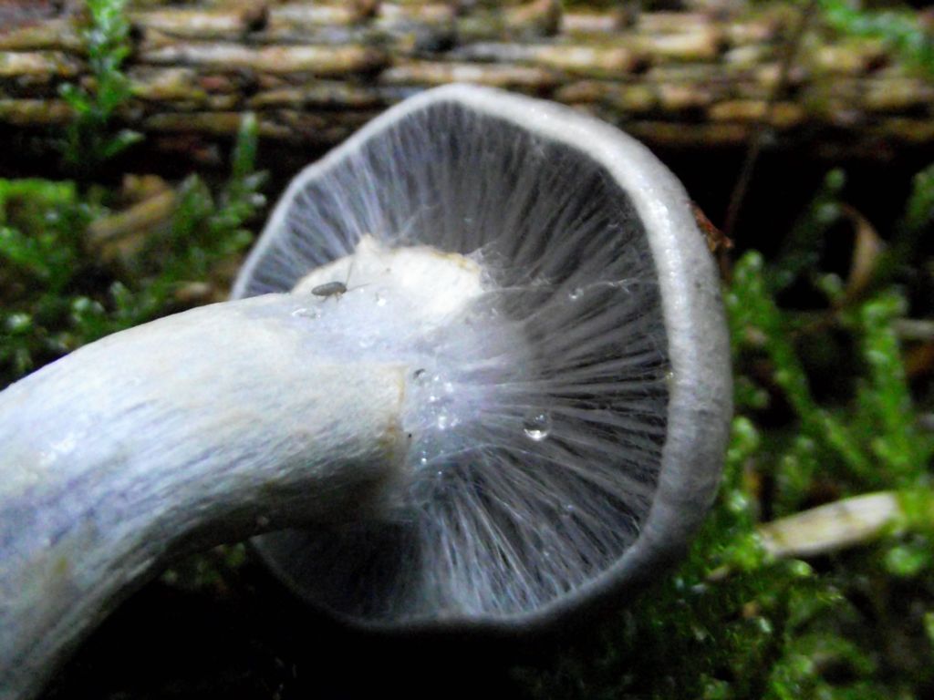 Hutunterseite: Lamellen am Stiel angewachsen bis schwach herablaufend, etwas entfernt stehend, jung violett, später zimtbraun-rostbraun