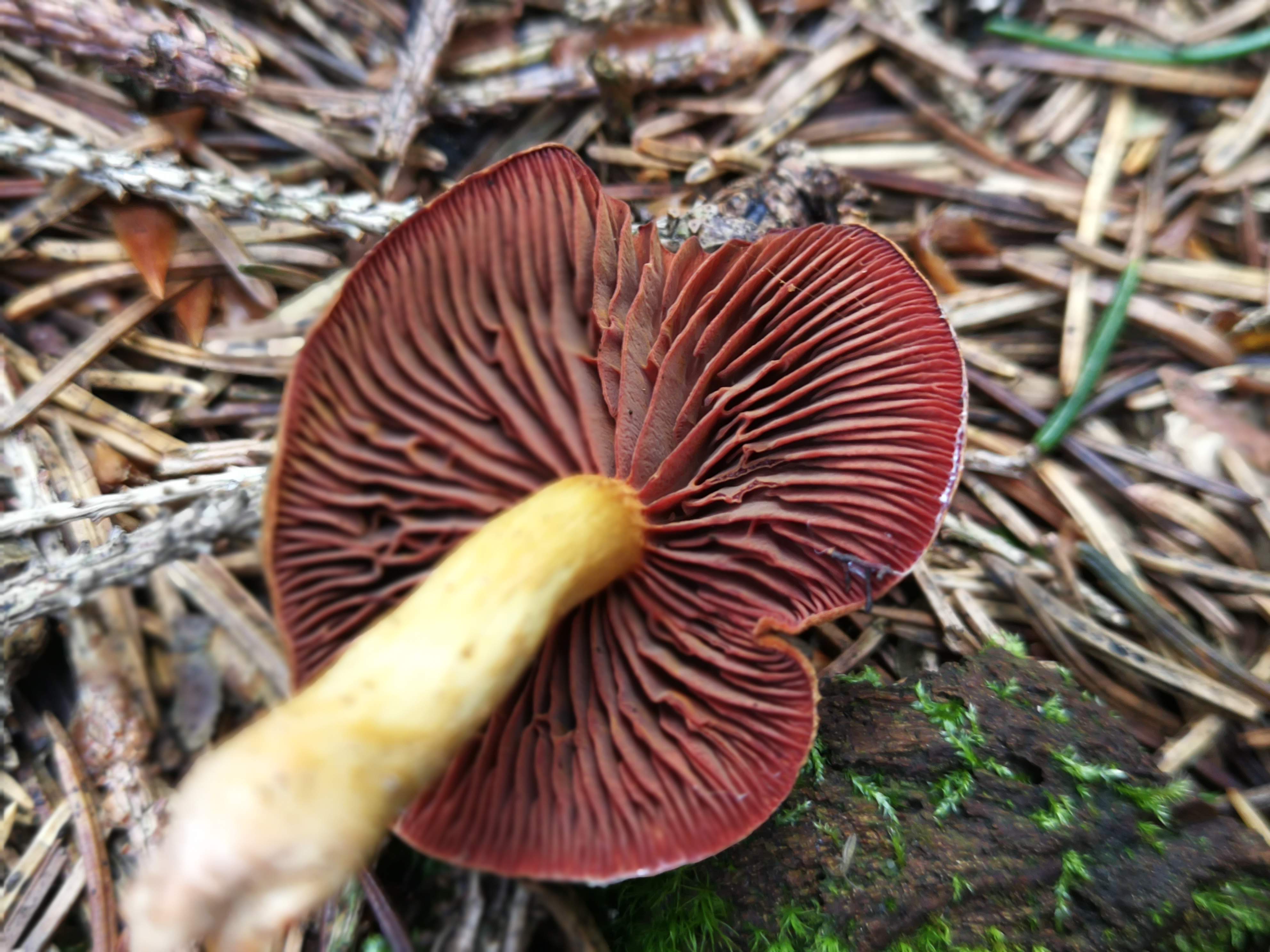 Lamellen breit angewachsen, etwas gedrängt, zinnober- bis blutrot, im Alter braunrot