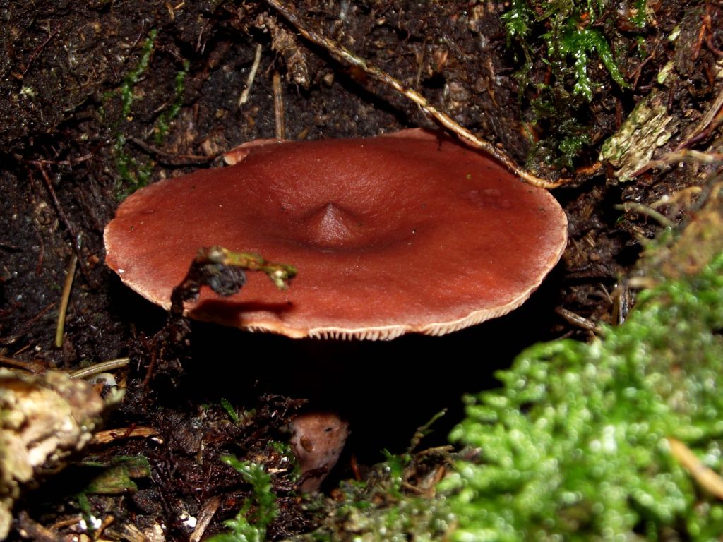Frontalansicht. Der Hut ist deutlich niedergedrückt und fast schon trichterförmig vertieft. Die Lamellen sind cremefarben und weisen einen leichten Rotstich auf. Die Stielfärbung ist ähnlich aber blasser wie die Hutfärbung.