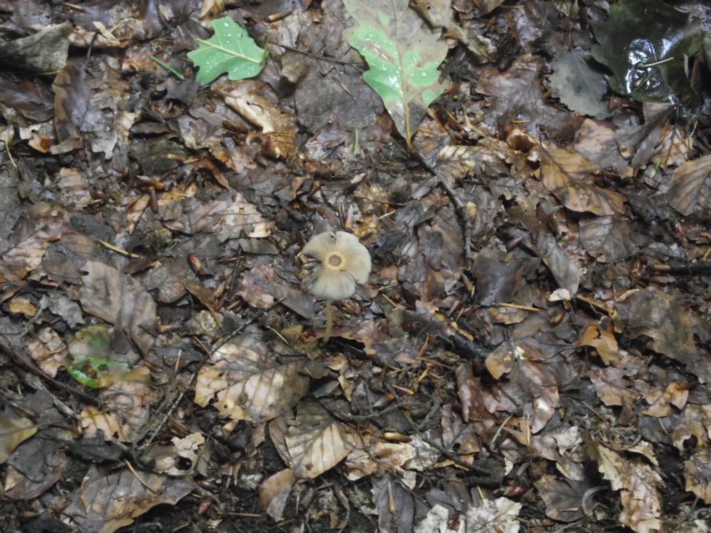 Ansicht von oben. Die Hutmitte ist etwas dunkler, die Oberfläche mit Fasern besetzt. Der Hutrand ist aufgerollt. Der Hut wirkt ziemlich rillig und ist leicht durchscheinend.