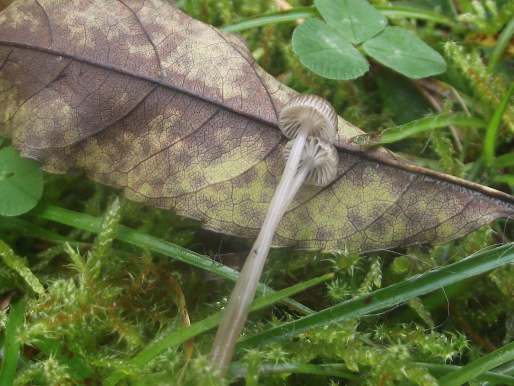 Ansicht auf ein liegendes Exemplar. Der Stiel zeigt sich fadenförmig und ist an der Basis dunkler gefärbt als aufwärts. Die Basis zeigt zudem weißliche Fibrillen.
