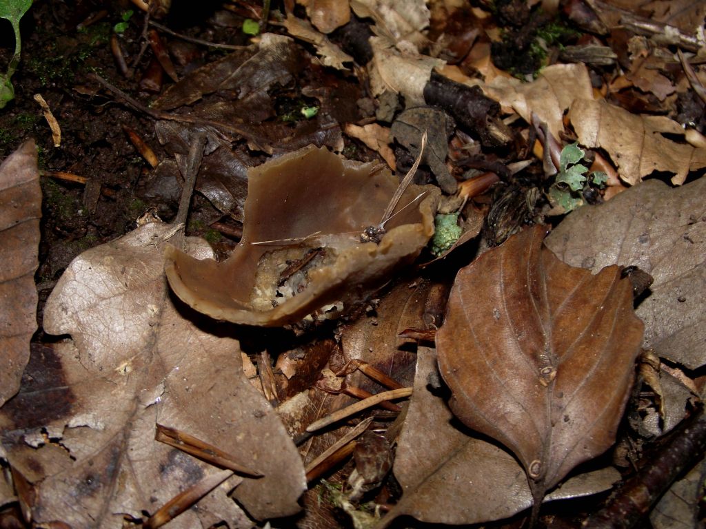 Ansicht von schräg oben. Die Fruchtkörperform zeigt sich becher- bis schüsselförmig.