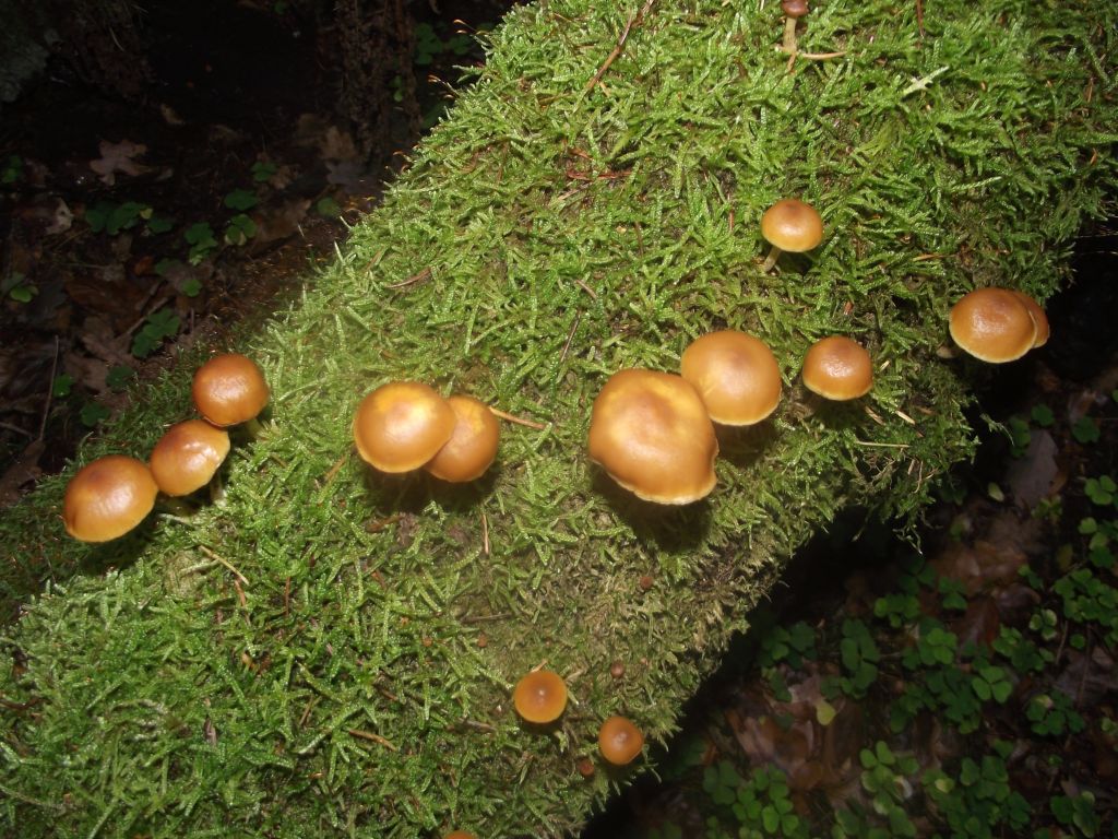 Ansicht von schräg oben. Stockschwämmchen kommen häufig in großer Anzahl an alten Baumstümpfen bzw. auch alten Baumstämmen vor.