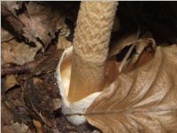 Volva in Nahaufnahme. Gut zu erkennen ist auch hier der Farbunterschied zwischen der Außen- und Innenseite. Erkennbar ist auch die feinschuppige Natterung am Stiel.
