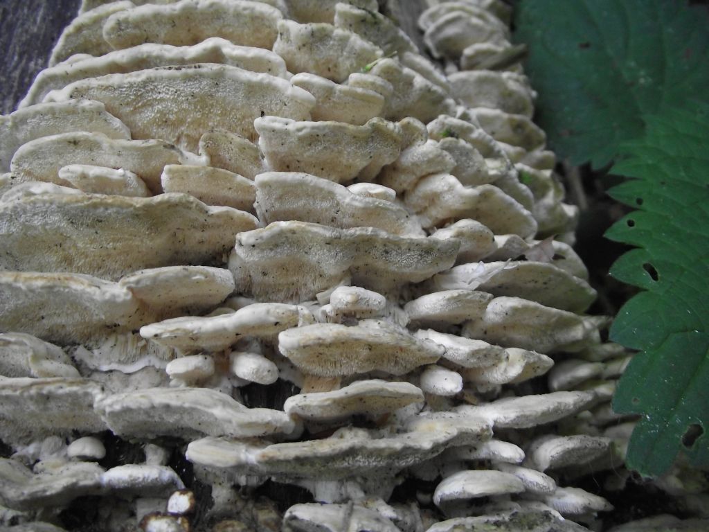 Frontalansicht. Die Buckel-Tramete kann vom Aussehen her sehr variabel sein; eines der wichtigen Erkennungszeichen sind die langgestreckten Röhren.