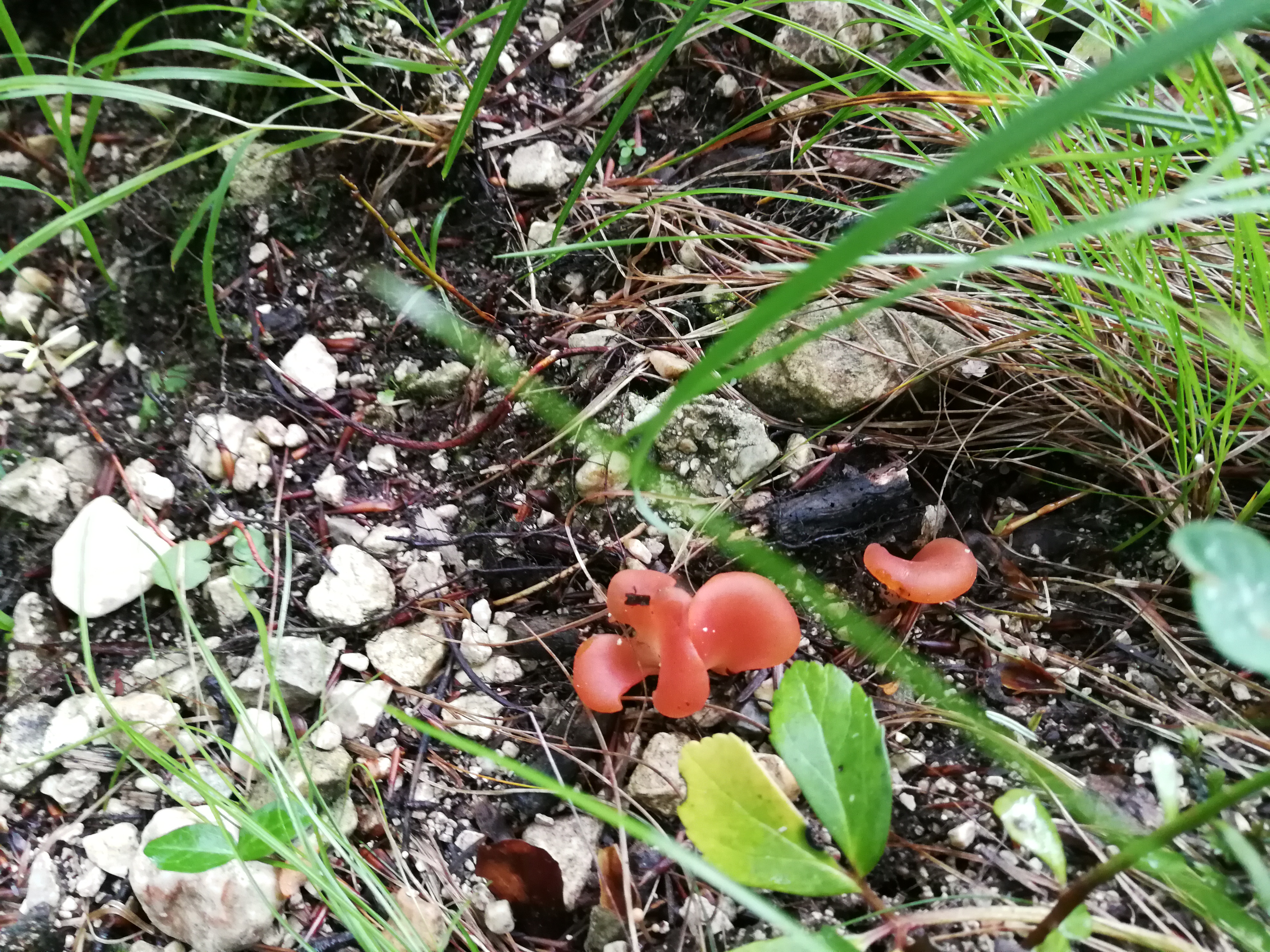 Ansicht von leicht schräg oben. Wir sehen den Rötlichen Gallerttrichterling an einem typischen Fundort - auf Wegen mit Kalkgehalt bzw. kalkhaltigen Steinen.