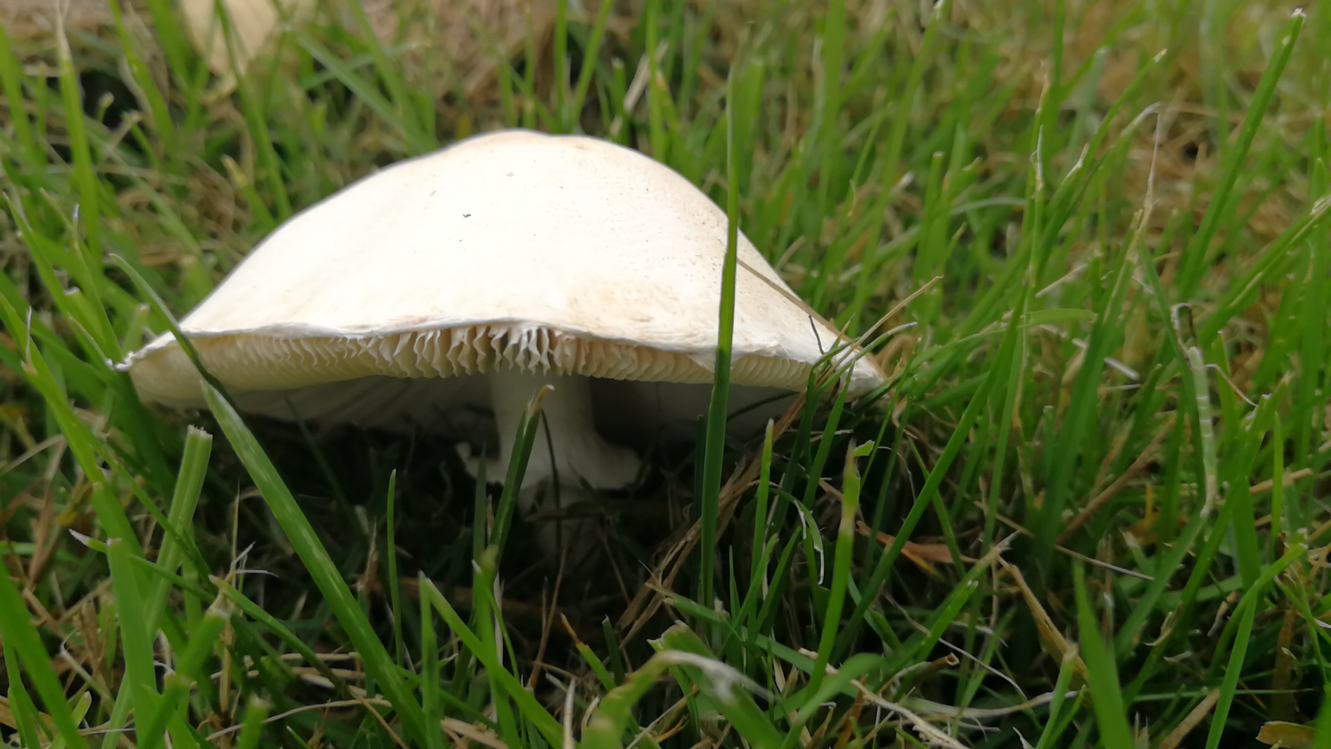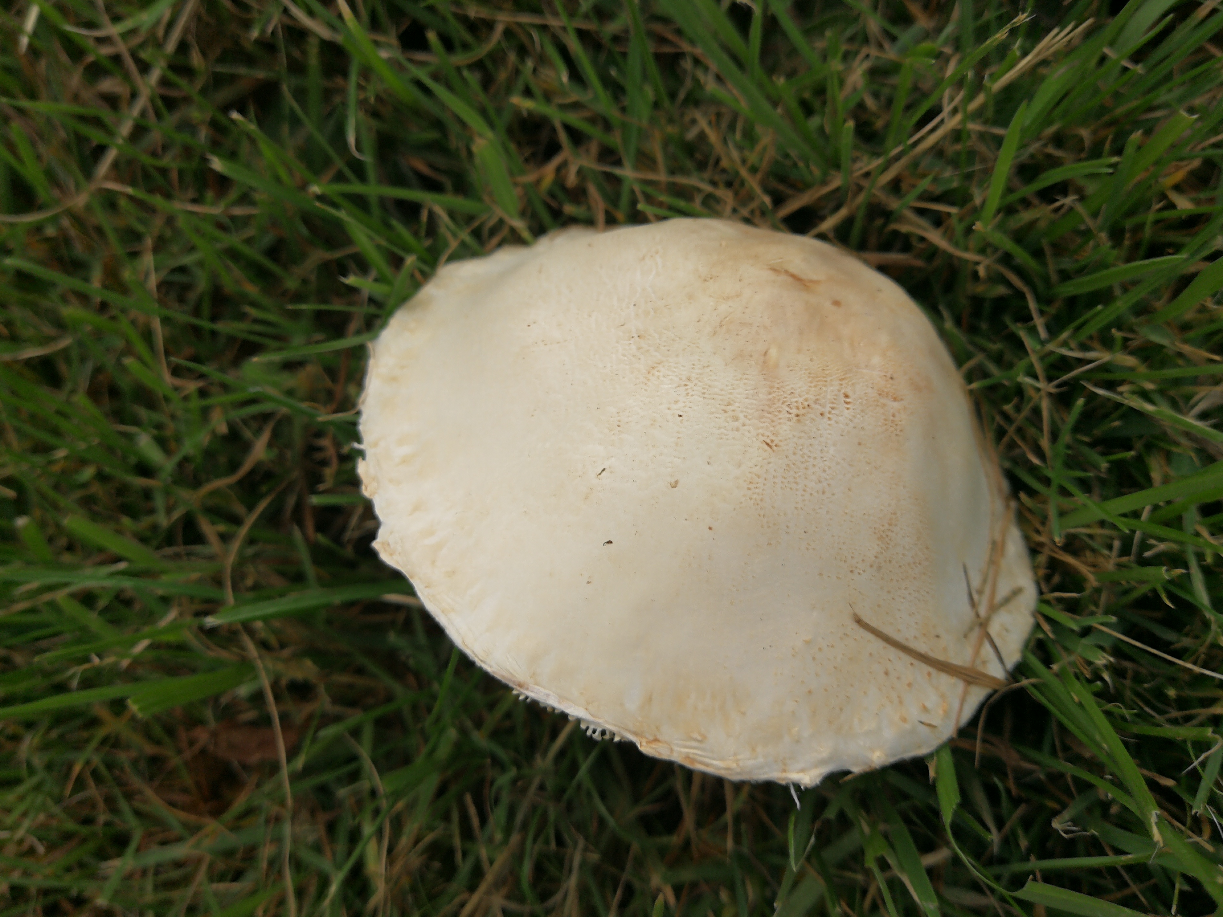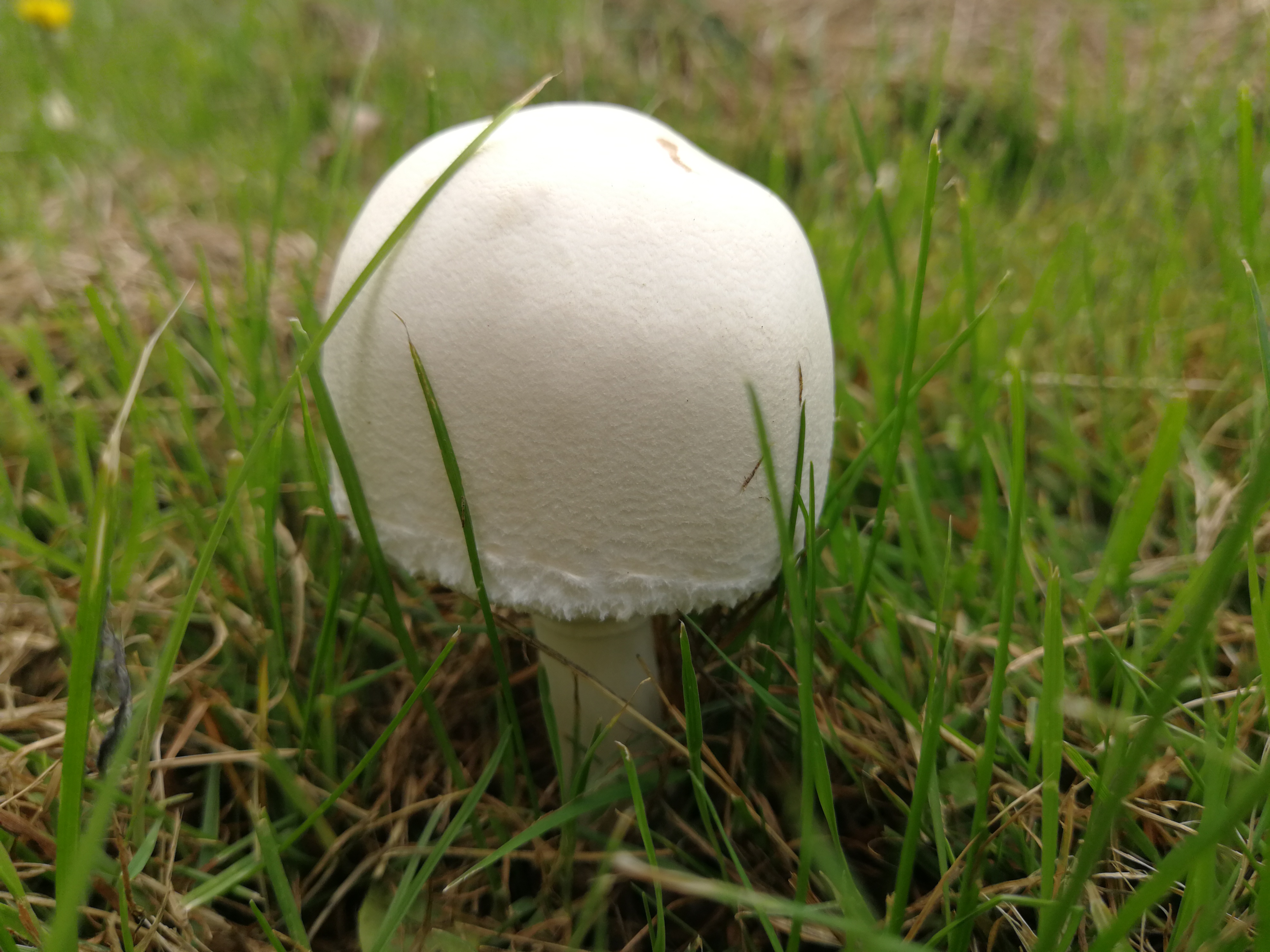 Frontalansicht. Zu erkennen ist der etwas kegelförmige, weiße Hut mit leichten Velumresten am Rand. Man nehme sich vor Verwechslungen mit Champignons in Acht, die z. T. den gleichen Standort haben.